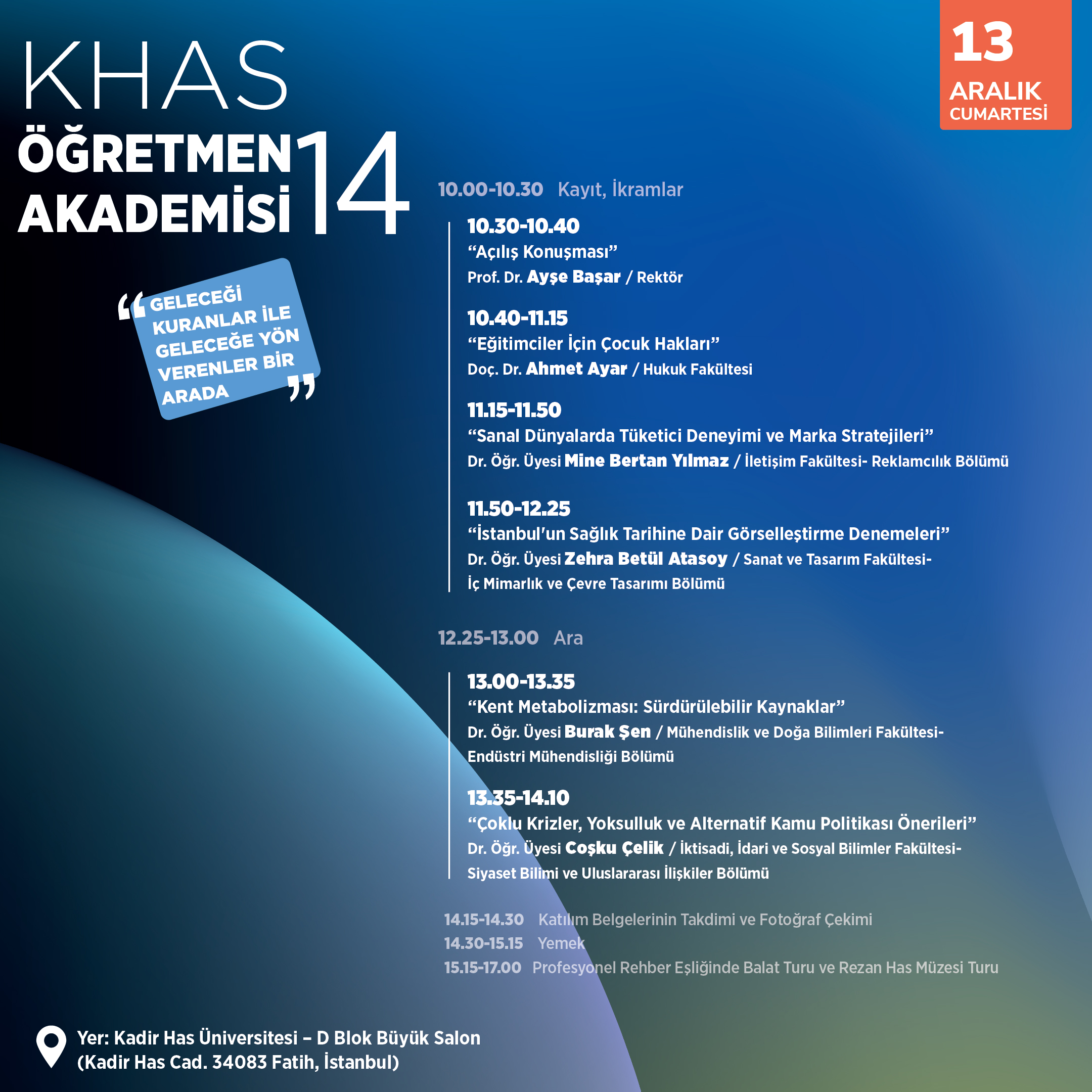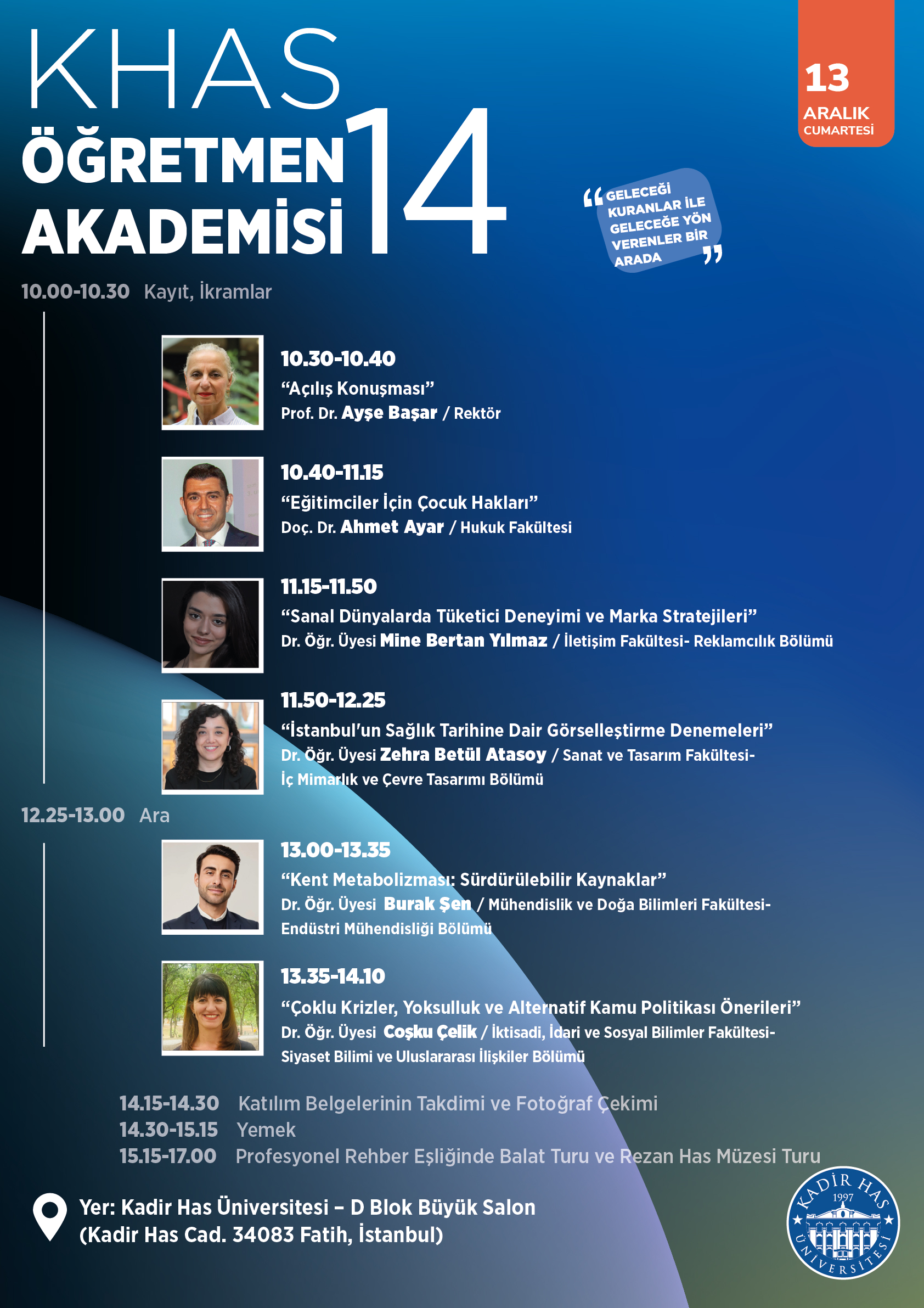 Rektörümüz Prof. Dr. Ayşe Başar , Doç. Dr. Ahmet Ayar (Hukuk Fakültesi), Dr. Öğr. Üyesi Mine Bertan Yılmaz (Reklamcılık Bölümü), Dr. Öğr. Üyesi Zehra Betül Atasoy (İç Mimarlık ve Çevre Tasarımı Bölümü), Dr. Öğr. Üyesi Burak Şen (Endüstri Mühendisliği Bölümü), Dr. Öğr. Üyesi Coşku Çelik (Siyaset Bilimi ve Uluslararası İlişkiler Bölümü) sunumlarının yer aldığı etkinlik, 13 Aralık 2025 Cumartesi günü saat 10.00’da, Kadir Has Üniversitesi D Büyük Salonda başlayacak. Akademimizin ardından etkinliğimiz profesyonel rehber eşliğinde Balat ve Rezan Has Müzesi turları ile devam edecek.